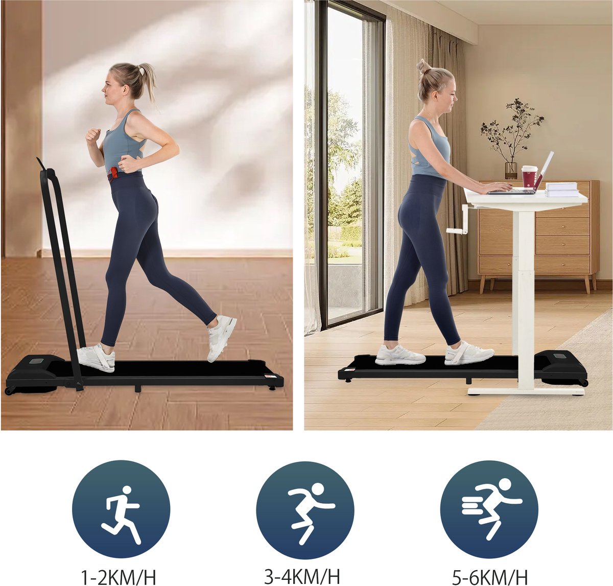 2-in-1 Ontwerp: Gebruik de loopband met de handgreep omhoog om te hardlopen tot 6 km/u, of klap de handgreep in om hem als wandelpad onder een bureau te gebruiken (1-4 km/u).