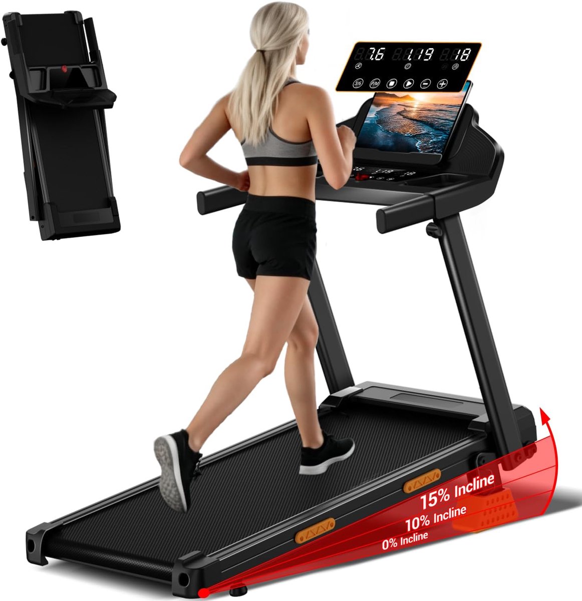Handmatige hellingshoek van 15%: Met de loopband met een hellingshoek van 0%, 10% en 15% kunt u thuis genieten van de ervaring van wandelen en bergbeklimmen. Door de boostpads aan te passen, kunt u de trainingsintensiteit verhogen om sneller calorieën te verbranden. Het voegt variatie en uitdaging toe aan uw thuistraining, waardoor u in dezelfde tijd betere fitnessresultaten behaalt.