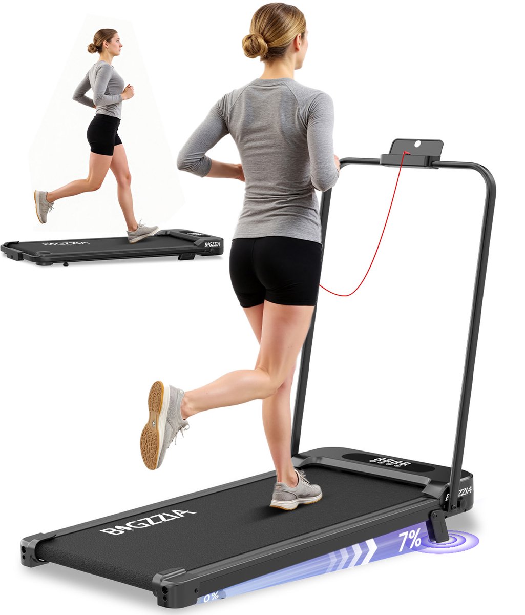 BIGZZIA 4-in-1 opvouwbare loopband met 7% helling – Inklapbaar loopband Elektrisch met armleuningen – 1-8 km/u – 2,5 pk motor – afstandsbediening – LCD-scherm – 130 kg draagvermogen – Geluid