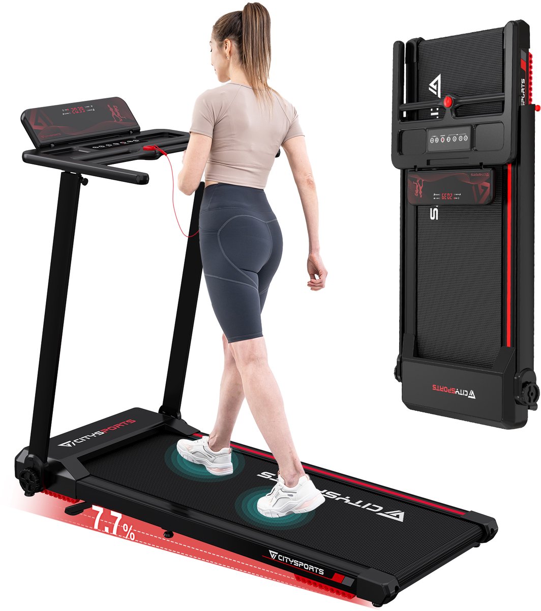 [Opvouwbare loopband met Bluetooth]CITYSPORTS loopband is een professioneel merk loopband voor thuis. Onze opvouwbare loopband is uitgerust met leuning en 360° tablethouder, zodat je je iPad op de standaard kunt zetten. Deze loopband heeft een geïntegreerde surround sound Bluetooth-luidspreker. Hij kan worden aangesloten met Bluetooth om video of muziek af te spelen tijdens het hardlopen of wandelen.