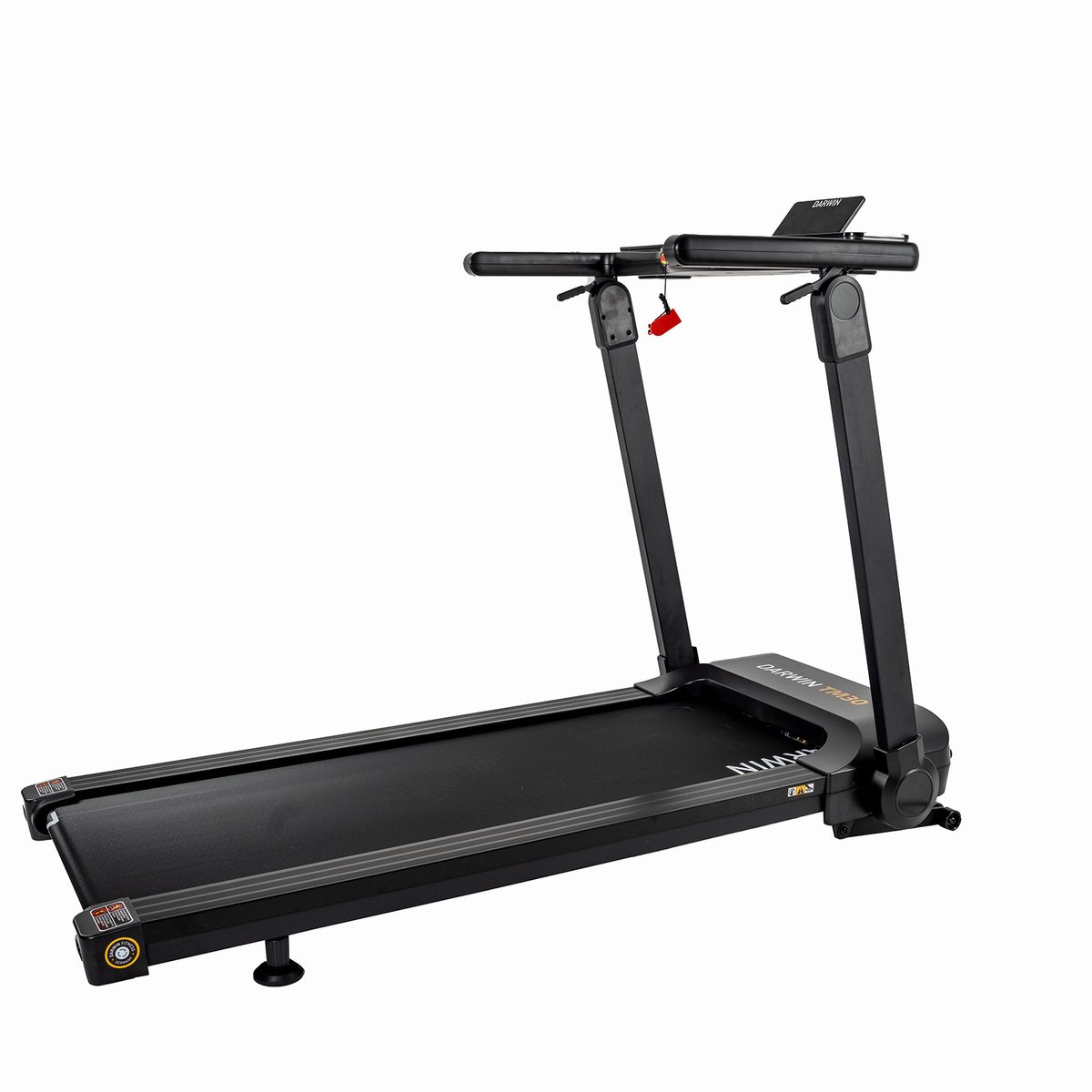 Console met app-compatibiliteit De TM30 Loopband is compatibel met een tal van fitness-apps. Aan de voorkant van de console bevindt zich een brede tablethouder. Op Kinomap kun je bijvoorbeeld echte routes volgen die andere gebruikers hebben gefilmd. Helaas kun je niet bergafwaarts. Andere apps zijn Fitshow of ZWIFT. De functionaliteit van de apps verschilt en kan extra kosten met zich meebrengen. Ingenieus vouwmechanisme: Superplat Eén, zo niet het meest opvallende kenmerk is het ingenieuze vouwmechanisme. In slechts drie stappen kan de console worden neergeklapt en kunnen de consolemasten met console plat op de loopband worden gelegd. Ingeklapt is de loopband slechts 22 cm hoog. Als hij beveiligd is tegen omvallen, kan hij zelfs rechtop worden opgeborgen, bijvoorbeeld tussen een kast en een muur. Dit vouwmechanisme heeft nog een tweede, tamelijk praktisch voordeel: de loopband wordt vrijwel geheel gemonteerd geleverd. Er moeten nog slechts twee kleine panelen worden geïnstalleerd. Binnen 30 minuten kun je jouw eerste sessie starten. En daar hoort ook het uitpakken, het weggooien van de verpakking en het aantrekken van sportschoenen bij. Handige bediening met jogwiel en snelkeuzeknoppen De console is ideaal: hij is eenvoudig, maar biedt overzicht over de training en is zeer gemakkelijk te gebruiken. Het centrale bedieningselement is het jogwheel, een draaiknop waarmee de snelheid letterlijk in een mum van tijd kan worden aangepast. Het jogwheel dient tevens als start- en stopknop. Andere bedieningselementen zijn de snelkeuzeknoppen voor snelheid en helling en de knoppen op de leuningen, waarmee beide waarden in kleine stappen kunnen worden aangepast. Modern design De Darwin Loopband TM30 heeft een zeer strakke, nette uitstraling en is daardoor in zekere zin tijdloos. Als je houdt van een strak en tijdloos design zit je goed met de TM30. Dit is bijvoorbeeld ook op het display te zien: Als het apparaat uitgeschakeld is, zie je alleen het zwarte oppervlak; de displays en het bedieningsoppervlak worden door de achtergrondverlichting pas zichtbaar als het apparaat is ingeschakeld. Sportieve loopband die erg vlak kan worden opgevouwen en zo ruimtebesparend kan worden opgeborgen Grotendeels voorgemonteerd : Klaar voor gebruik in minder dan 30 minuten Compatibel met veel apps: Fitshow (gratis)Kinomap (voor volledige functionaliteit is een Abonnement vereistZWIFT (Abonnement vereist) Eenvoudige bediening via draaiknop (jogwheel) en snelkeuzeknoppen Eenvoudig te verplaatsen dankzij transportwielen Inclusief tablethouder (tevens afneembaar) en twee bidonhouders Helling instelbaar in 15 niveaus Borstelloze motor met veel voordelen:Langere levensduurHoger energierendementLagere warmteontwikkelingNog stiller in gebruikBetere elektronische regelbaarheid