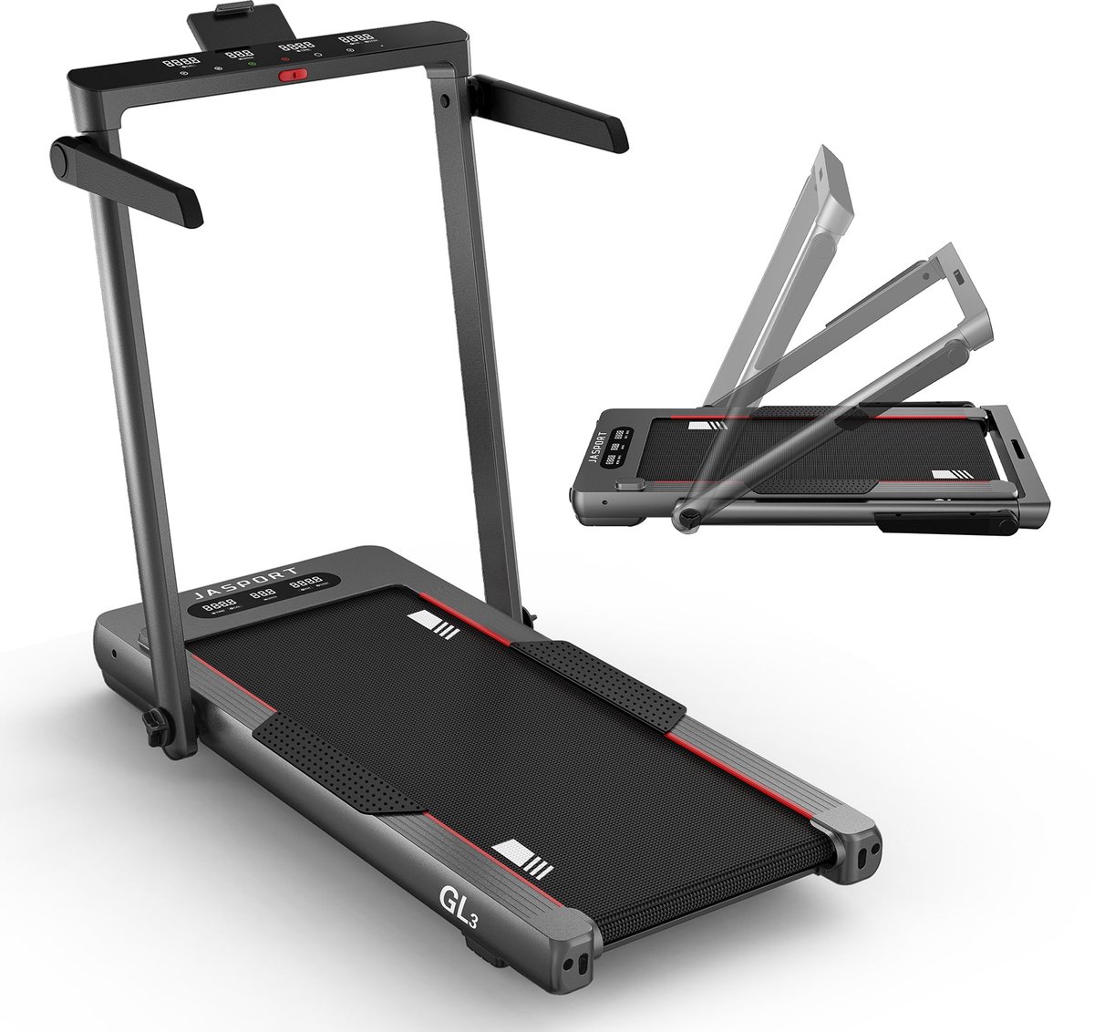 JASPORT GL3 2-in-1 Loopband – flexibel trainen thuis en op kantoor De JASPORT GL3 is een veelzijdige 2-in-1 loopband die speciaal is ontworpen voor zowel wandelen tijdens het werk als actieve looptraining thuis.