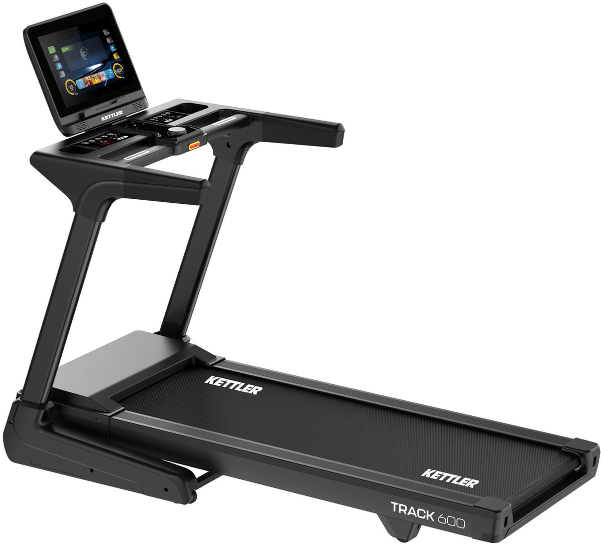 Kettler Track 600 loopband – Slimme technologie ontmoet trainingsvariatie De Kettler Track 600 is een moderne loopband die een afwisselende en comfortabele trainingservaring thuis biedt. Met zijn ruime loopvlak van 150 x 51 cm, krachtige 3 pk continumotor en geavanceerde console biedt hij ideale omstandigheden voor effectieve duurtraining – ongeacht je prestatieniveau. De 15,6 inch touchscreen-console zorgt voor een bijzonder heldere weergave van alle trainingsgegevens. De Kettler Track 600 is compatibel met vele populaire fitnessapps, waaronder Zwift, Kinomap, Peloton (alleen in Duitsland en Oostenrijk), Fitshow (gratis) en andere aanbieders. Afhankelijk van de app kunnen helling en snelheid automatisch worden aangepast. Voor een extra realistische ervaring zijn er drie Virtual Active routevideo’s voorgeïnstalleerd. De trainingsintensiteit is bijzonder flexibel te regelen: je kunt je instellingen op elk moment direct aanpassen met vijf sneltoetsen voor snelheid en helling, het touchscreen of het praktische draaiwiel. Door op de draaiknop te drukken, wissel je naadloos tussen snelheids- en hellingsregeling. Een tweelaagse, 2,5 mm dikke loopmat gecombineerd met acht elastomeerelementen zorgt voor comfortabele demping. Dit vermindert de belasting van je gewrichten merkbaar, zelfs bij hoge snelheden tot 20 km/u. De elektronische hellingshoekverstelling maakt hellingen tot 10% mogelijk in 15 niveaus – ideaal voor afwisselende trainingen met wisselende inspanningsniveaus. Een ander hoogtepunt is de geïntegreerde draadloze oplader, waarmee je je smartphone gemakkelijk kunt opladen tijdens je training. De Track 600 meet ook je hartslag via geïntegreerde handsensoren of – nog nauwkeuriger – via een optionele borstband (telemetrie). Met in totaal 46 trainingsprogramma’s, waaronder 10 vrij programmeerbare, 27 standaardprogramma’s en 9 hartslaggestuurde opties, kun je je hardloopsessies afstemmen op je trainingsdoelen. Het aanbod wordt gecompleteerd door 12 motiverende wedstrijdprogramma’s tegen virtuele tegenstanders. Ondanks zijn functionaliteiten blijft de Kettler Track 600 ruimtebesparend: hij is na de training eenvoudig op te vouwen en dankzij de transportwielen moeiteloos te verplaatsen. Een energiebesparende modus verlaagt het energieverbruik in de stand-bymodus nog verder. Met een belastbaarheid tot 150 kg en een hoogwaardige afwerking is deze loopband geschikt voor iedereen die waarde hecht aan moderne technologie, slimme bediening en veelzijdige trainingsmogelijkheden. Krachtige DC-motor met 3 pk continu vermogen – geschikt voor lange en intensieve trainingssessies Groot loopoppervlak (150 x 51 cm) – veel ruimte en hoge tredzekerheid, zelfs tijdens snelle runs Uitstekende demping – tweelaagse loopmat, 18 mm loopvlak en 8 elastomeerelementen beschermen de gewrichten 15,6-inch touchscreenconsole – duidelijke weergave van alle trainingsgegevens, eenvoudige bediening en multimediafunctie App-compatibiliteit – Fitshow (gratis), Kinomap, Zwift, (sommige abonnementen vereist) Trainingsprogramma’s: 27 standaardprogramma’s (inclusief doel- en conditietests) 12 wedstrijdprogramma’s tegen virtuele tegenstanders 9 hartslagprogramma’s (met 65, 75, 85% van de maximale hartslag) 10 individueel op te slaan profielen Comfort & Controle:Jogwiel voor snelle aanpassing van helling/snelheid5 directe selectieknoppen voor helling + 5 directe selectieknoppen voor snelheidGeïntegreerd trainingsdagboek voor het monitoren van uw succes Extra’s:Draadloze oplader voor smartphones (15 W)Twee USB-poorten: opladen en media afspelenHouders voor drankjes en sleutelsVirtual Active routevideo’s (3 inbegrepen) Helling verstelbaar in 15 stappen