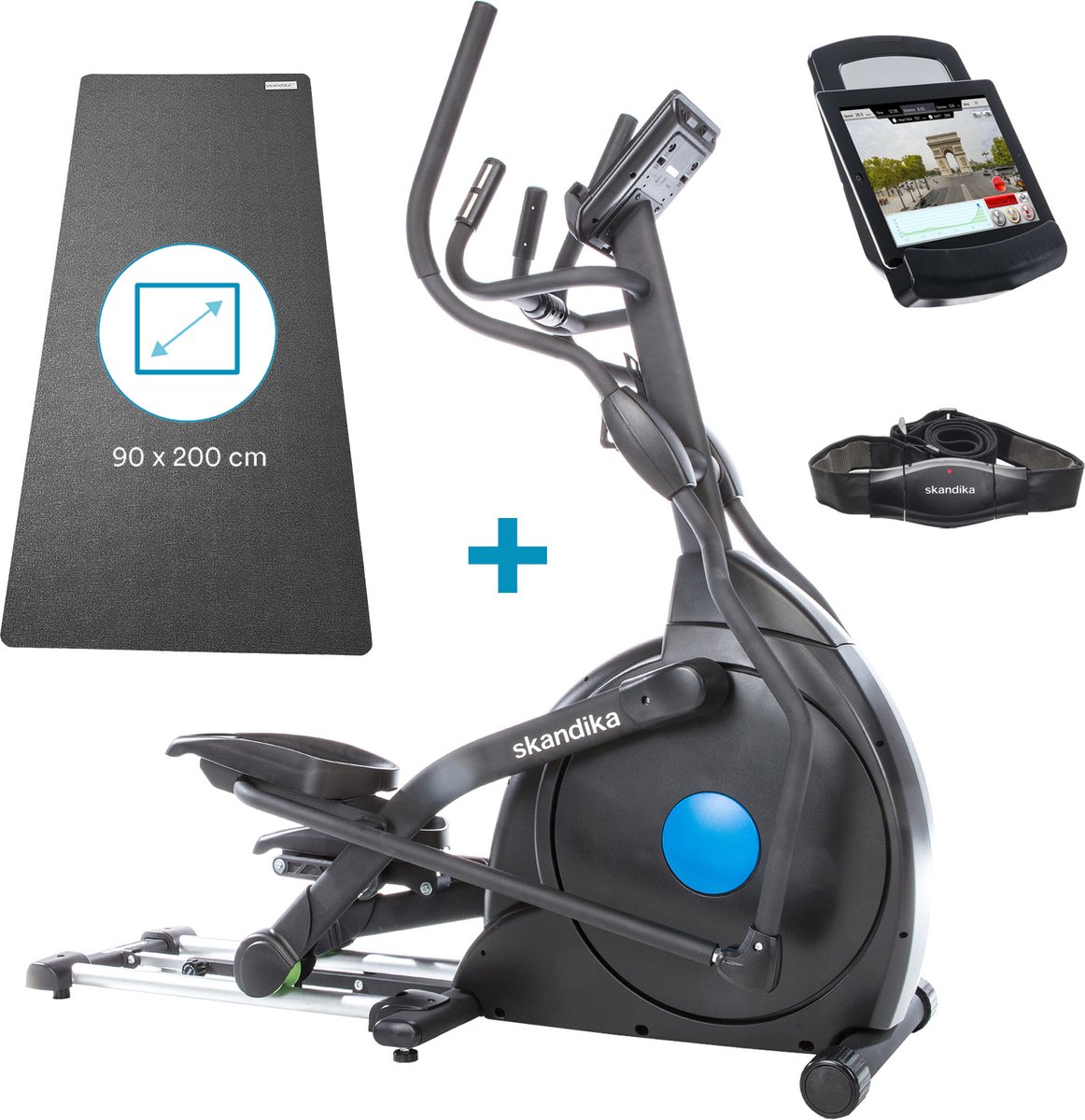 Skandika CardioCross Carbon Champ Elliptische Crosstrainer met beschermingsmat – Crosstrainers – Cardio trainer met 24,5kg vliegwielmassa en magnetisch remsysteem – Multifunctionele computer, Bluetooth, tablethouder, Kinomap – Tot 150kg – zwart