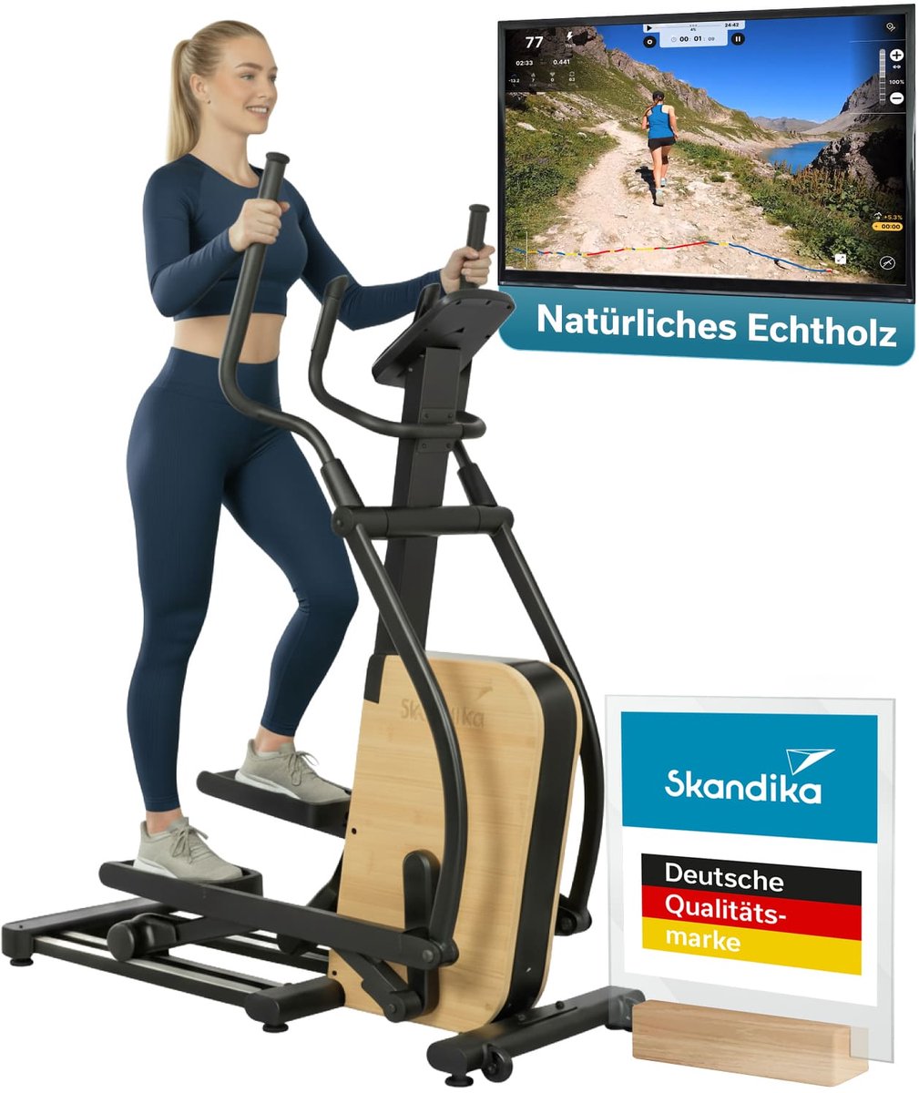 Skandika crosstrainer voor thuis Treliv P22 – Crosstrainer elliptische trainer, frame van ijzer met echt hout, 32 standen, 22 programma’s, magneetrem, compatibel met Kinomap app, Bluetooth, tot 135 kg