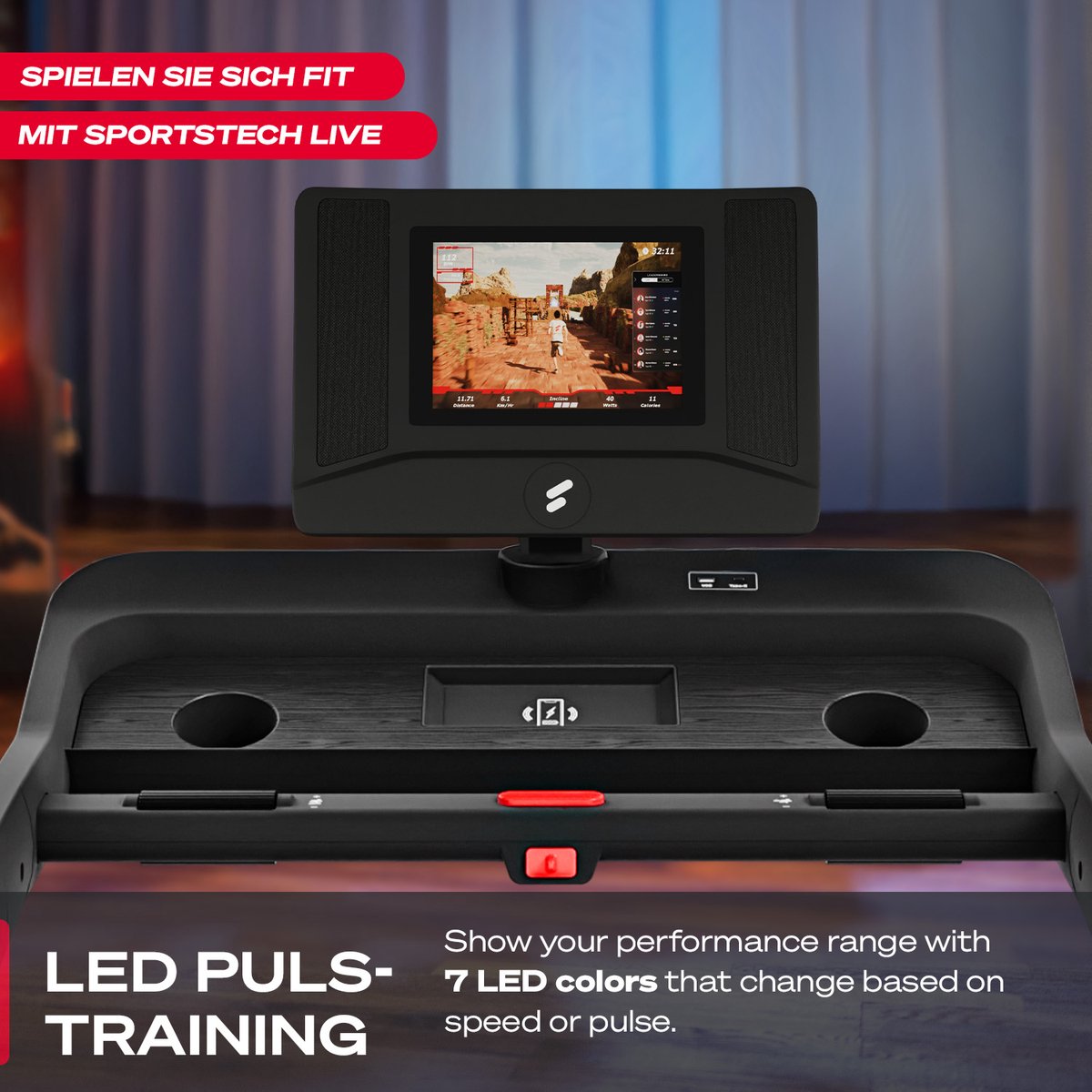 Unieke LED-verlichting: Motiverende 7-kleuren-LED’s passen zich aan uw snelheid of hartslag aan – voor een dynamische trainingservaring.