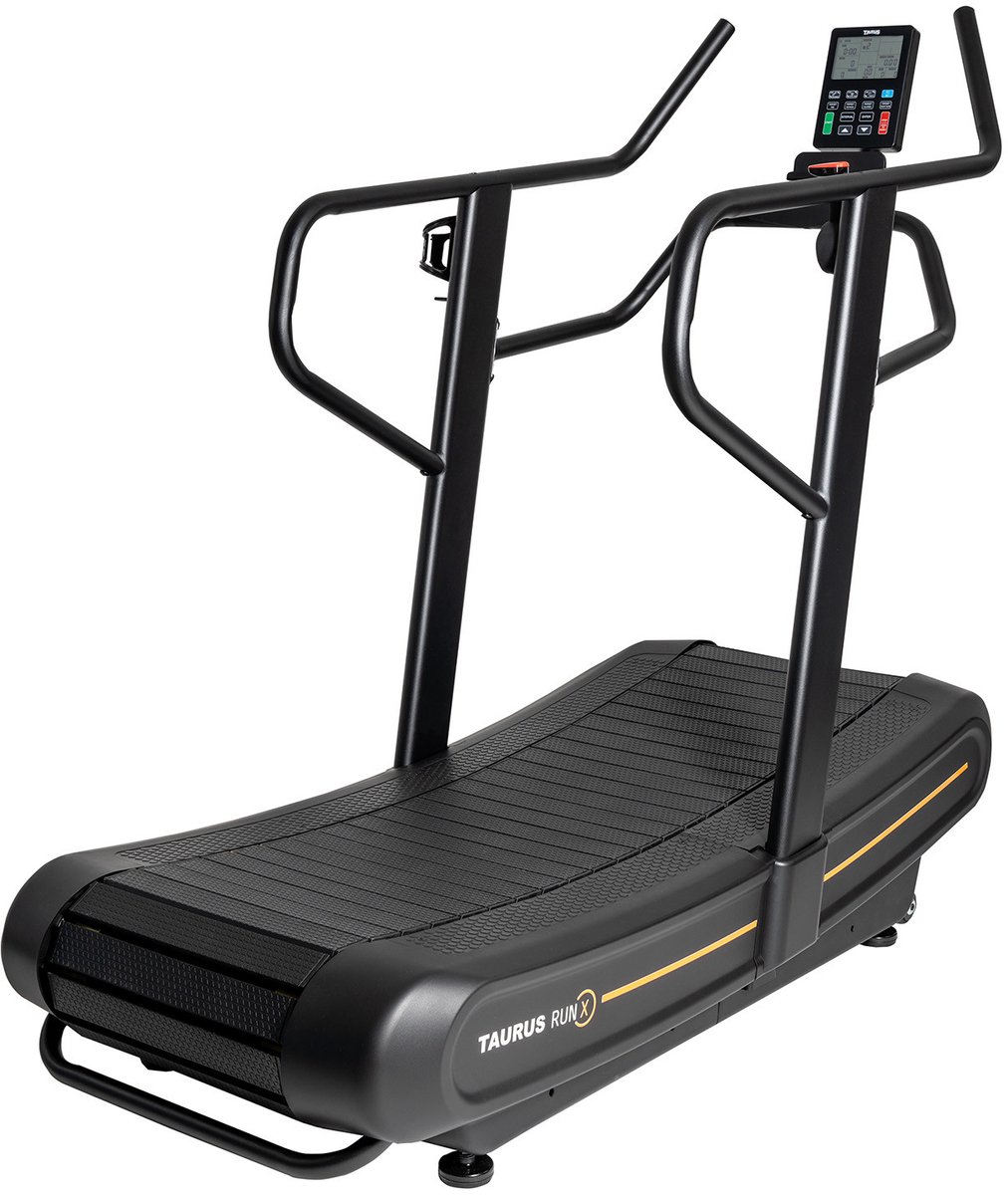 Taurus Run-X: de sprinter onder de loopbanden Ervaar zelf bepaalde loopbandtraining op onbeperkte maximale snelheid op de Run-X van Taurus: De Run-X is een zogenaamde Curved Treadmill-loopband die zonder motor werkt. Het loopvlak is aan de voor- en achterkant naar boven gebogen, waardoor het loopvlak op een bocht lijkt. Als je naar voren stapt, zet dat de loopmat in beweging en duw de loopband zelf voort op je loopsnelheid. Hierdoor bepaal je zelf het tempo en reageert de Run-X direct op je snelheidsveranderingen. Dit loopband principe maakt de Run-X ideaal voor bijvoorbeeld HIIT-units waarin fasen van de hoogste intensiteit worden afgewisseld met fasen van lage snelheid. Met deze training kan nog meer worden bereikt in een kortere trainingstijd, doordat bijvoorbeeld bij een HIIT-unit het zogenaamde afterburn-effect in het spel komt, waardoor je na de training nog tot 48 uur calorieën verbrandt. De Run-X heeft zeven verschillende trainingsprogramma’s en biedt je nog meer afwisseling dan zijn voorganger. Je kan kiezen uit drie doelprogramma’s voor tijd, afstand, calorieën, het doelhartslagprogramma met waarschuwingstoon, het intervalprogramma van 10/20 seconden, het intervalprogramma van 20/10 seconden en het door de gebruiker gedefinieerde intervalprogramma. Deze loopband heeft ook vier weerstandsniveaus die je kunt instellen met een hendel aan de zijkant van de loopband. Dit geeft je de mogelijkheid om bergritten te simuleren en een extra trainingsprikkel in je training op te nemen. Maximale veiligheid, zelfs bij topsnelheden De Run-X heeft zeer lange leuningen en brede treeplanken, waardoor je tijdens de training veilig je grenzen kunt verleggen. Ren tot je niet meer kunt en ‘spring’ er dan gewoon af. Het gestructureerde oppervlak op de treden en de leuningen aan de zijkant zorgen voor een veilige grip. Bovendien geeft het bijzonder lange loopvlak elke loper een veilig en comfortabel loopgevoel, ook bij hoge snelheden. Je kan de verstelbare pootjes ook gebruiken om oneffenheden in de vloer te egaliseren, zodat de loopband stevig en veilig op de vloer staat. Enorme stabiliteit en veerkracht Om intensieve trainingssessies te kunnen doorstaan, is de loopband zeer solide: het frame is extreem robuust en het oppervlak van het loopvlak van hardplastic latten is erg sterk. Zelfs bij de snelste sprints wiebelt er niets met de Run-X. Ondanks zijn massieve constructie is de Run-X flexibel in te stellen in je woonkamer, doordat de loopband is voorzien van een tilbeugel (aan de achterzijde) en transportwielen. Dit betekent dat de loopband kan worden opgetild, verplaatst en overal in de kamer kan worden opgesteld, zonder gedoe met kabels. Het hoogtepunt in jouw fitnessruimte – thuis, in het hotel of in de studio De Run-X is niet alleen het ultieme trainingsapparaat voor thuis: de stabiliteit, materiaalkwaliteit en veerkracht zijn zo hoog dat de loopband zelfs wordt aangeboden met garantie voor professioneel gebruik. De Run-X is de ideale loopband voor fitnessruimtes waar hardlopers van verschillende trainingsniveaus samenkomen, want langzaam lopen is net zo goed mogelijk als extreme sprints. Upgrade uw sportclub, fitnessstudio, hotel of bedrijfsfitnessruimte met de Run-X – uw leden, gasten en medewerkers zullen er met plezier op trainen! Perfect geschikt voor HIIT-training (High Interval Training) Geen ingewikkelde elektronica, geen motor, extreem robuust, dus bijna geen slijtage 7 programma’s: doelprogramma’s (tijd, afstand, calorieën), doelhartslag met waarschuwingstoon, 10/20 interval, 20/10 interval en door de gebruiker gedefinieerd interval Verschillende moeilijkheidsgraden Eenvoudig, goed leesbaar display Uitzonderlijk robuuste constructie: gebruikersgewicht maximaal 150 kg Ongelimiteerde snelheid, de loopband gaat zo snel als dat jij kunt rennen Extra lang loopoppervlak biedt enorme zekerheid bij hoge snelheden De gebogen loopband is ideaal voor snelle snelheidswijzigingen Extra lange leuningen bieden veiligheid voor beginners en stellen professionals in staat nog sneller te rennen Loopmat gemaakt van harde kunststof lamellen: extreem duurzaam Loopvlakken naast de loopmat zijn extra breed De loopband heeft poten zodat hij op een oneffenondergrond waterpas kan worden afgesteld Geen stroomaansluiting nodig (display werkt met 4x AAA) De loopband heeft een groot handvat aan de achterkant zodat je hem op kan tillen. Dankzij de handige transportwieltjes kan je de loopband verplaatsen Incl. Tablethouder Slimme compatibiliteit met Kinomap: loopsnelheid wordt overgedragen naar Kinomap, je bepaalt nog steeds zelf de snelheid.